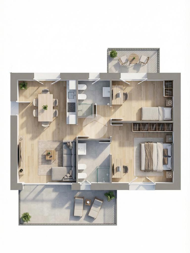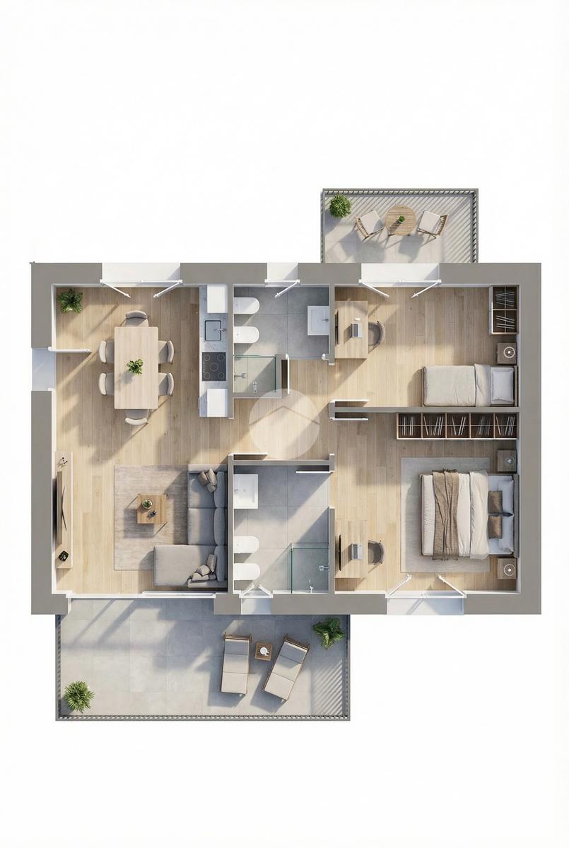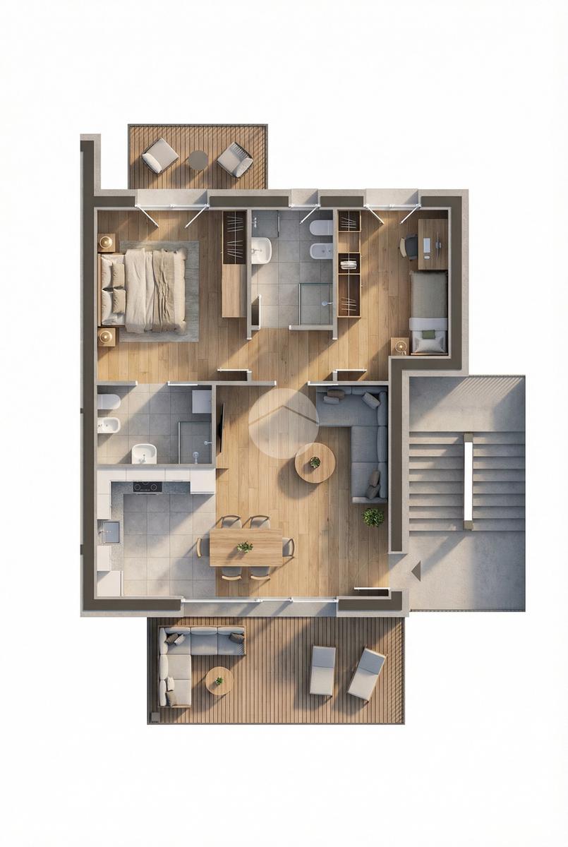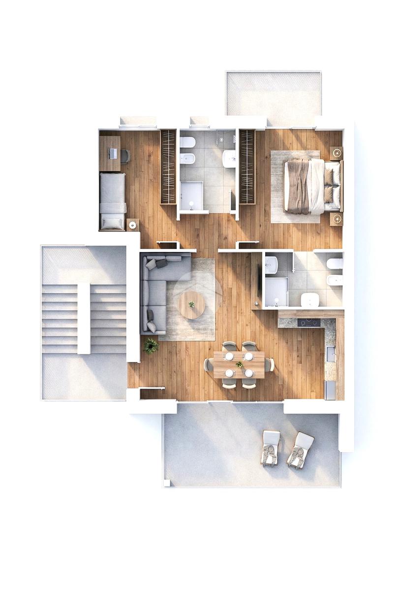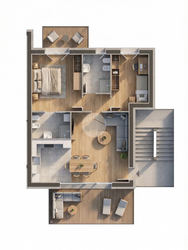 Gli appartamenti sono composti da una ampia zona giorno con angolo cottura, due camere da letto e doppi servizi; i piani terra godono di un porticato e di un giardino privato mentre i piani alti sono dotati di ampie terrazze dalle quali si può godere della vista lago.
