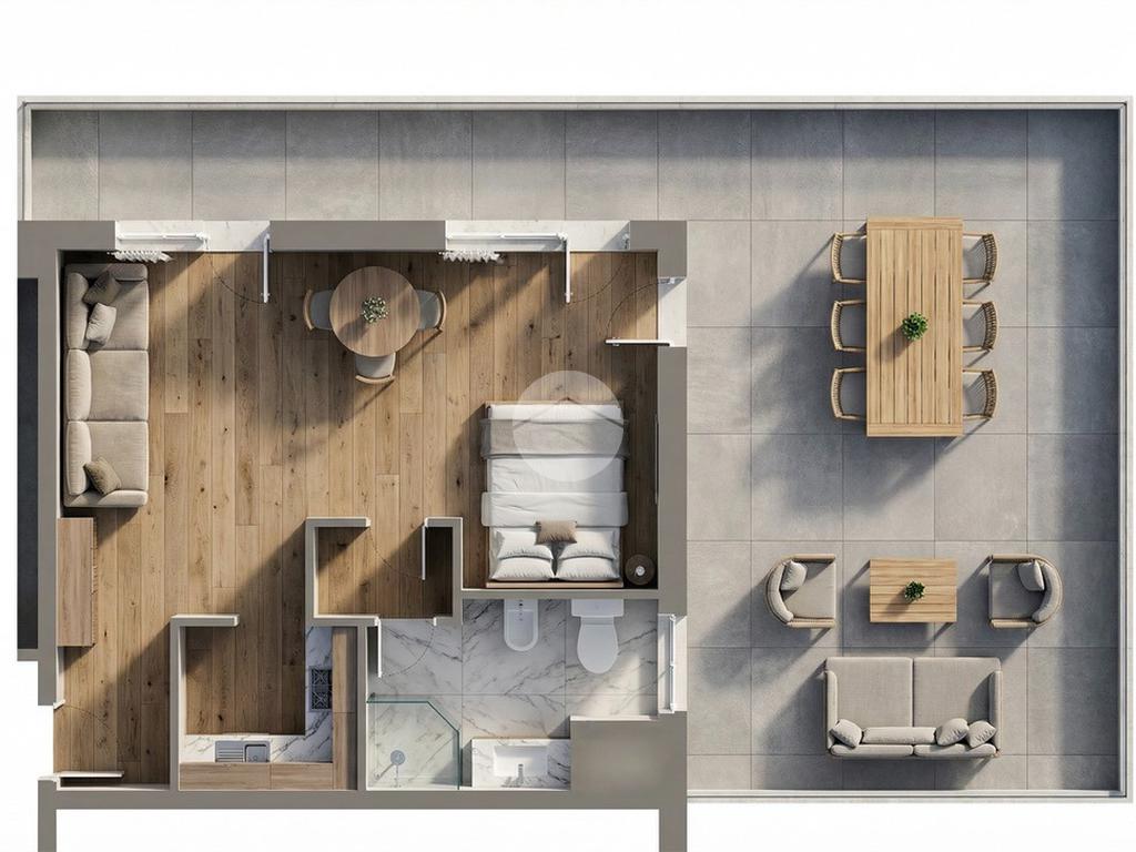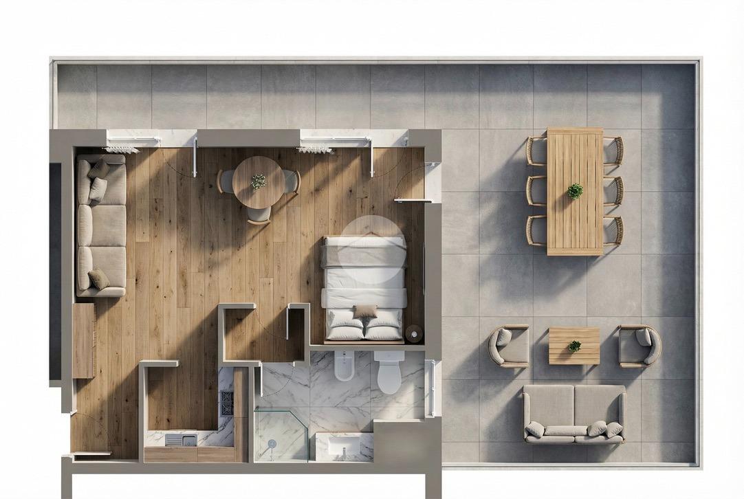 L’appartamento si compone di un unico locale dove troviamo angolo cottura una zona salotto e per mezzo di una porta divisoria a tutta parete la camera da letto ed un ampio bagno con doccia finestrato. Il Terrazzo di circa 40 mq è il pezzo forte della proprietà consentendo la possibilità di pranzare e rilassarsi mantenendo la privacy. Completa la proprietà un posto auto.