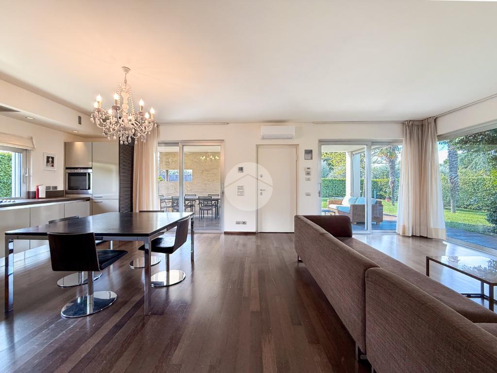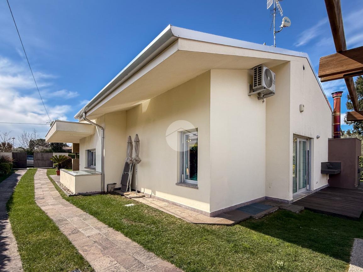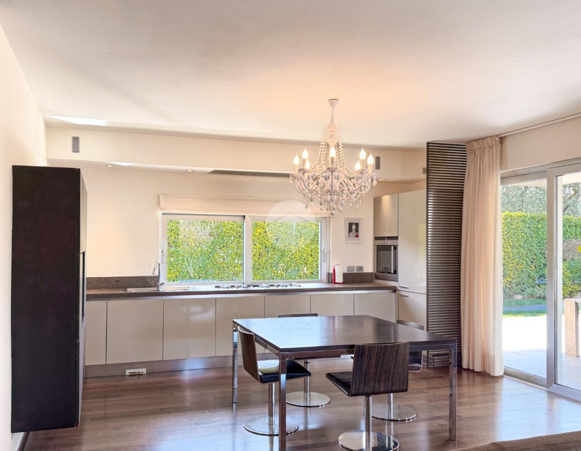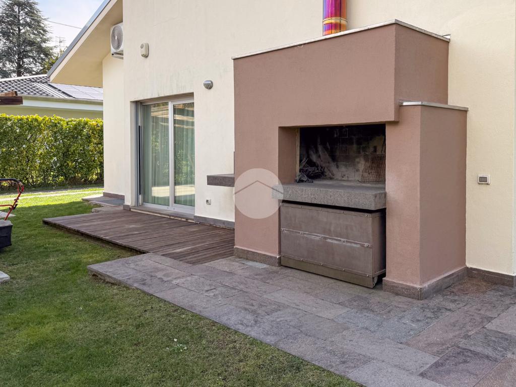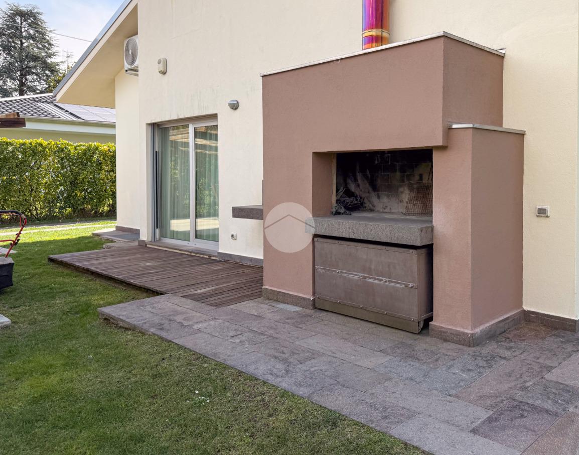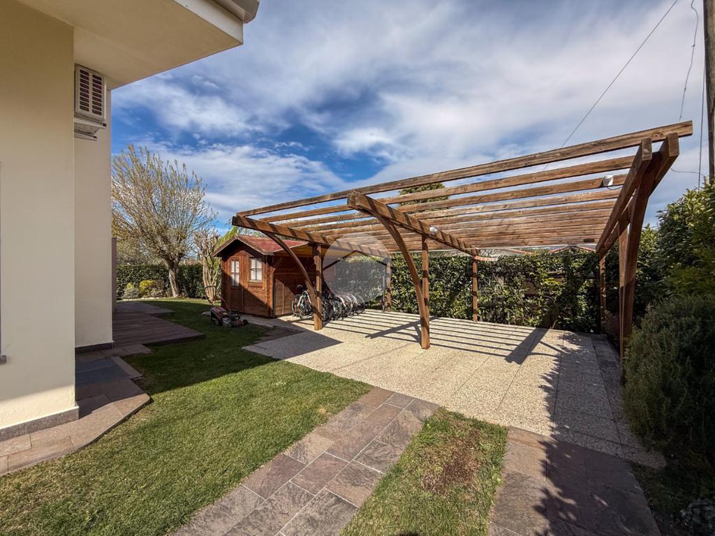 All’esterno, la villa è circondata da un curato giardino privato, ideale per momenti di relax e convivialità, con possibilità di realizzare piscina. Completano la proprietà ampi spazi accessori e due posti auto coperti.