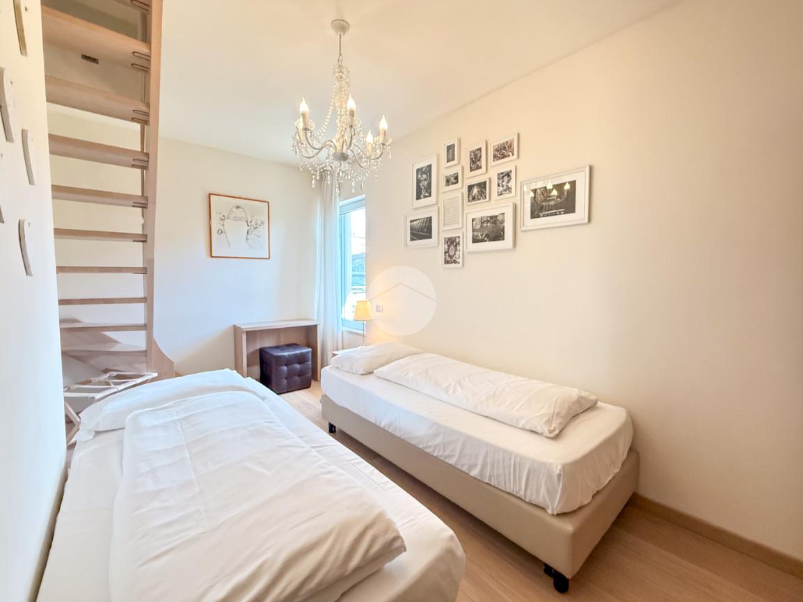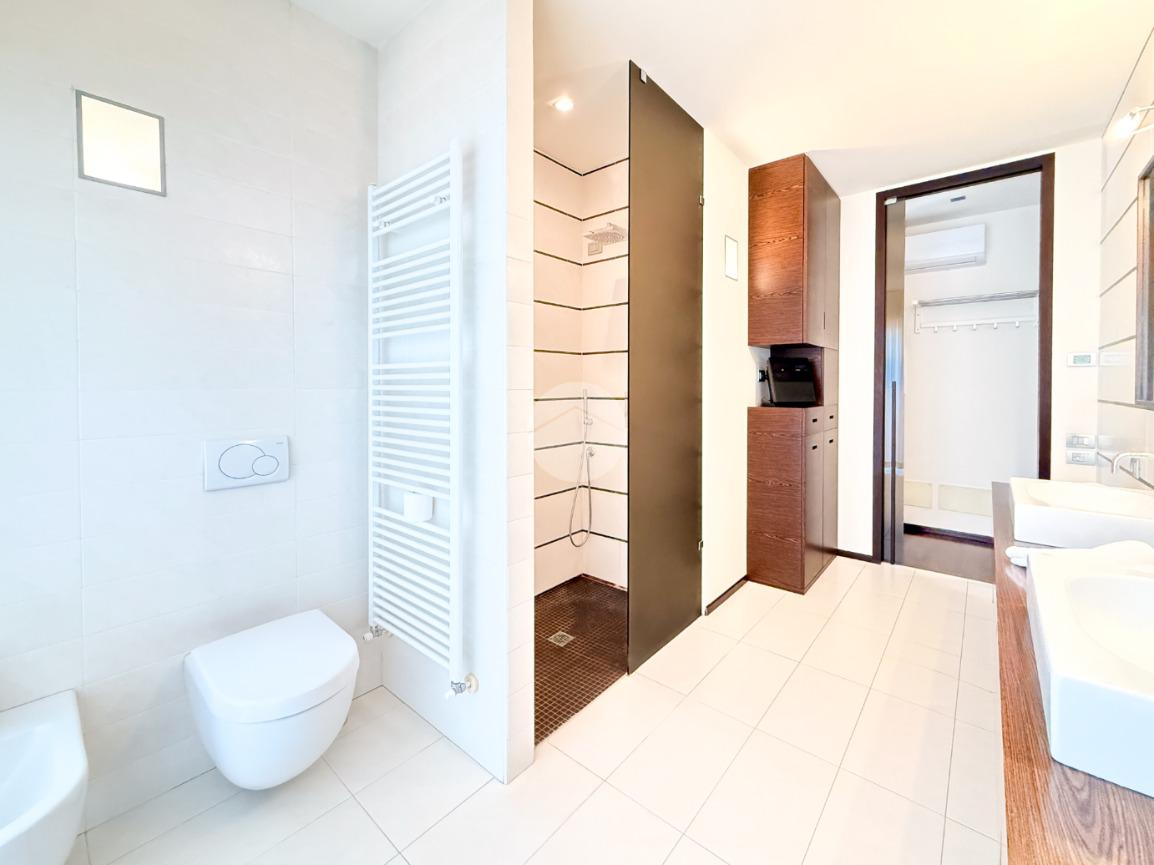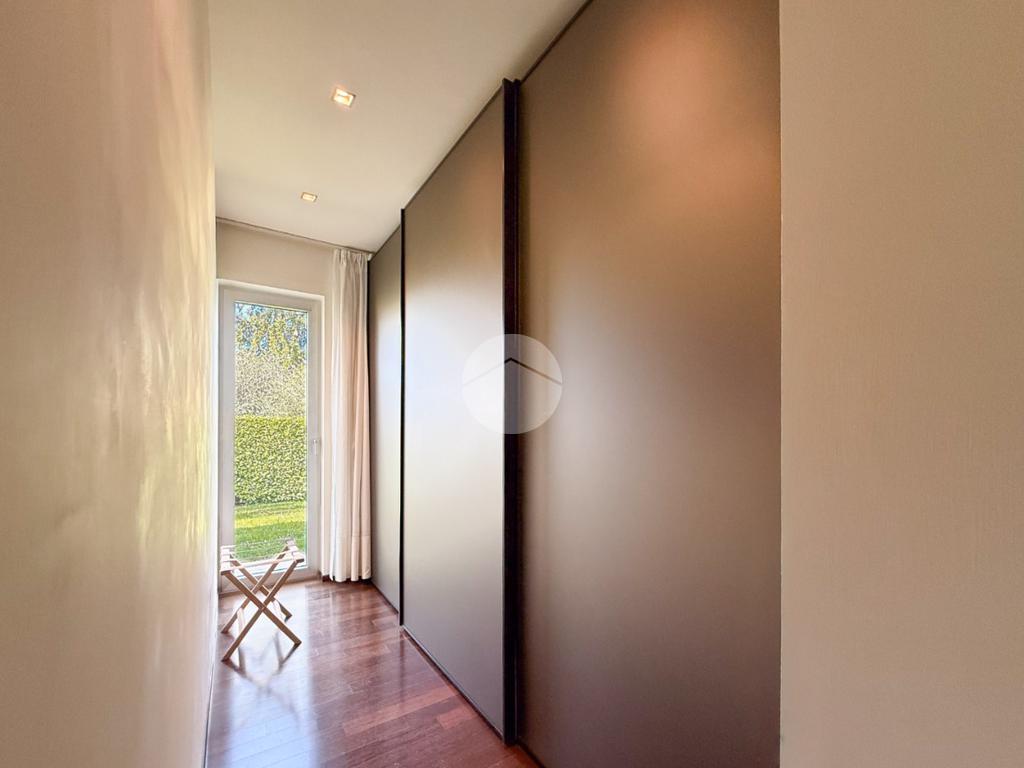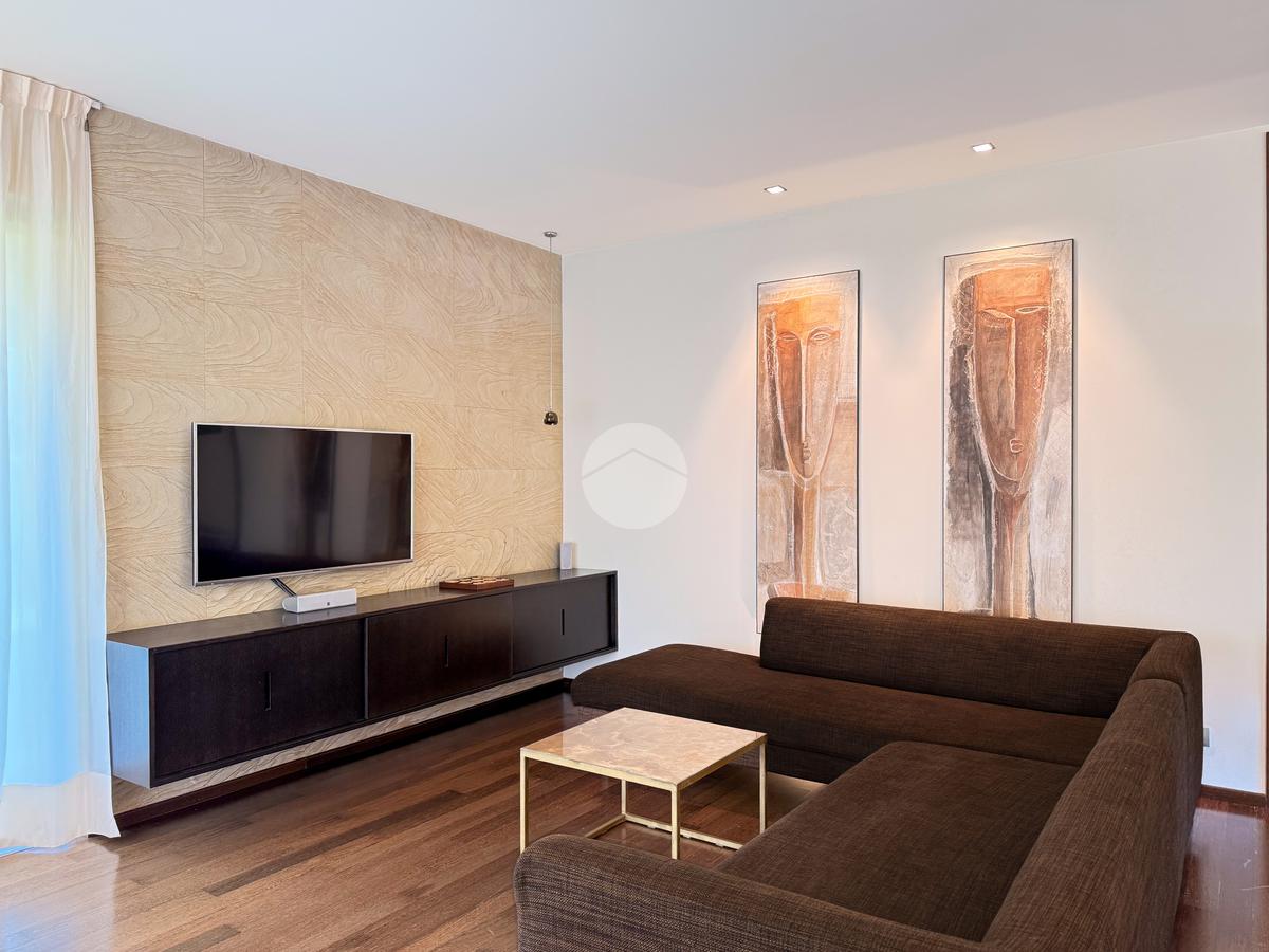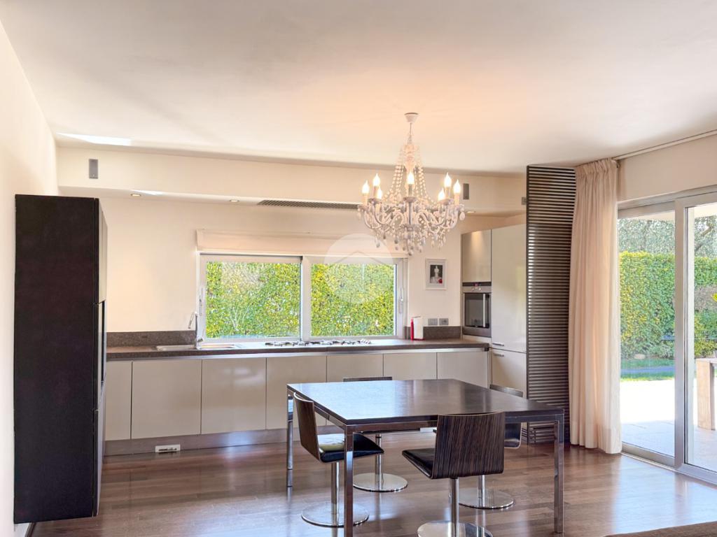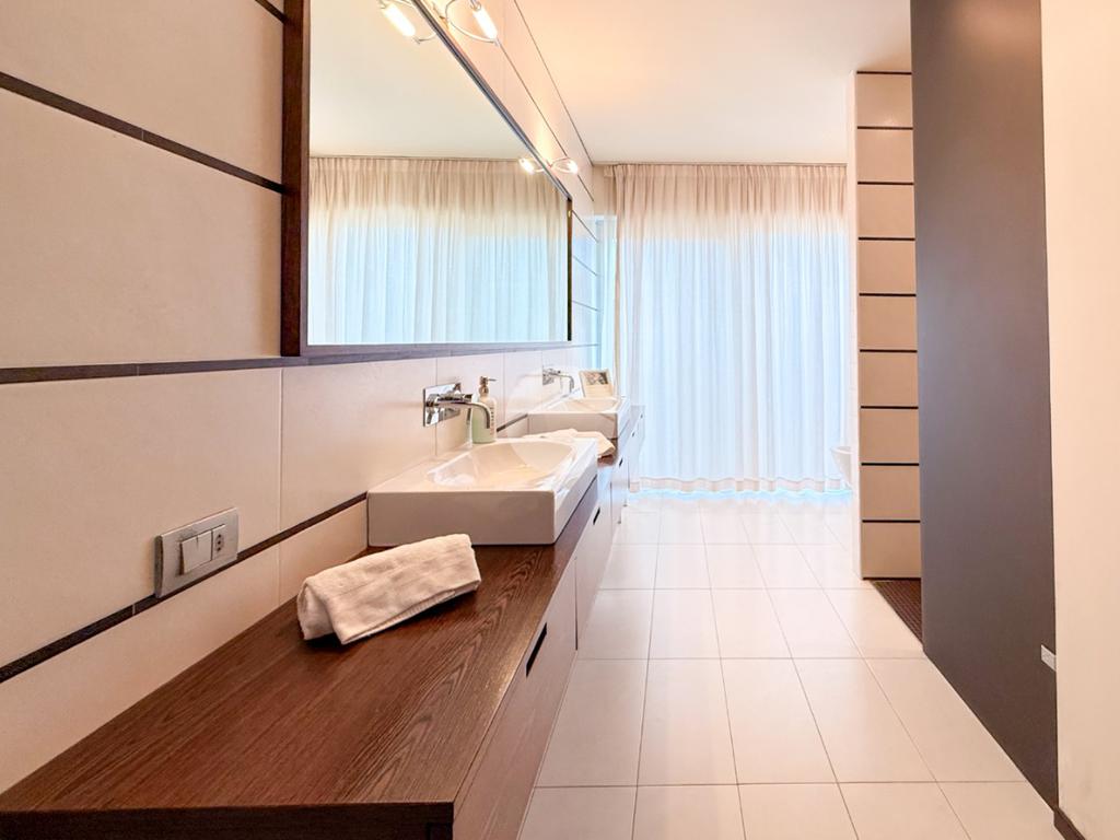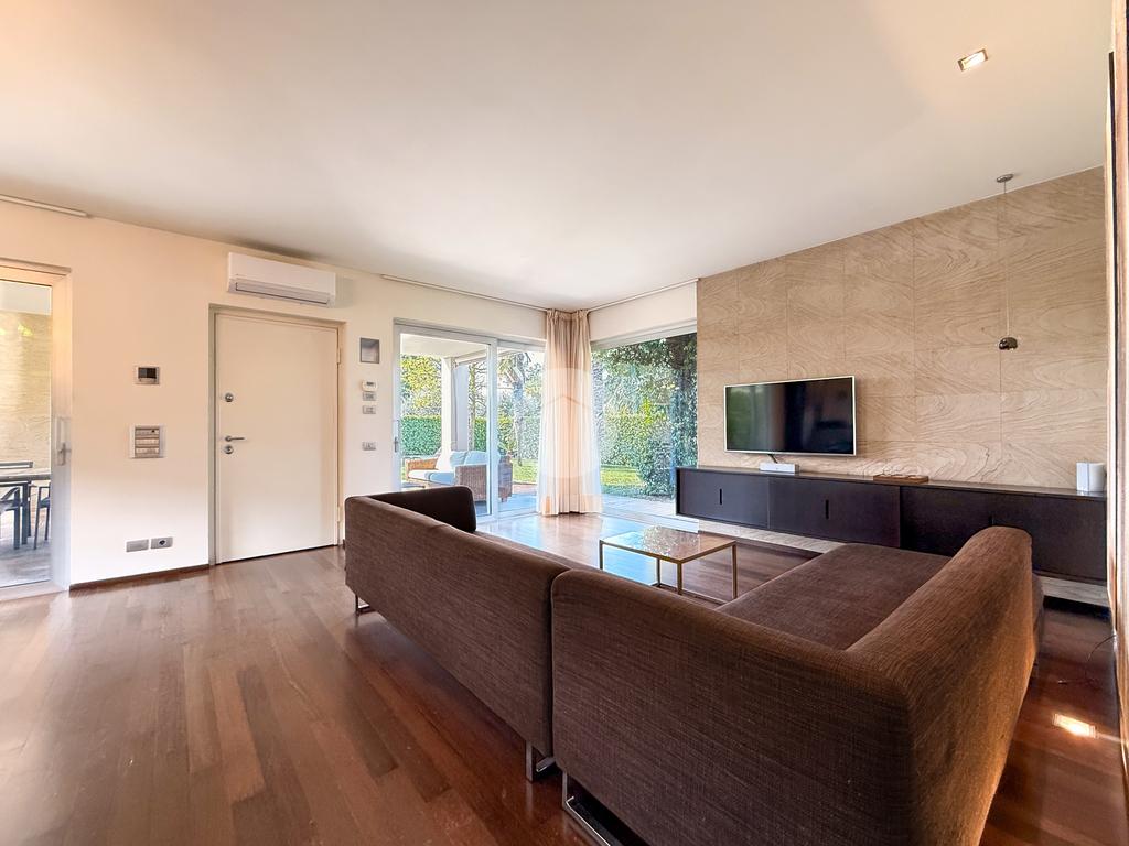 La proprietà si sviluppa su tre livelli e offre una superficie generosa, perfettamente distribuita per garantire comfort e funzionalità. Al piano terra l’ingresso conduce a un’ampia zona living, luminosa grazie alle grandi vetrate, con affaccio diretto sull’ ampio porticato e sul giardino privato finemente piantumato; la cucina, moderna e completamente attrezzata, è pensata per soddisfare anche i clienti più esigenti. La zona notte ospita due camere da letto, tra cui una suite padronale con cabina armadio e un grande bagno; quest’ultimo rifinito con materiali di pregio offre soluzioni eleganti e contemporanee.